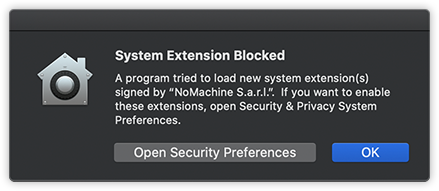 When installing NoMachine (either a server or the client package) for the first time on macOS High Sierra 10.13 or later, users will receive the 'System Extension Blocked' message from the system.