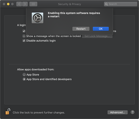 "macOS High Sierra 10.13 introduces a new feature that requires user approval before loading new third-party kernel extensions." (Ref. https://developer.apple.com/library/archive/technotes/tn2459/_index.html#//apple_ref/doc/uid/DTS40017658)