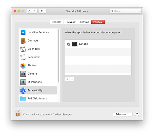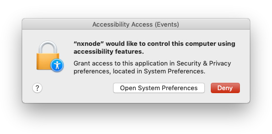 The local user, if administrator, can then add the nxnode application to the list of apps that may control the Mac. Otherwise the remote user will be able to access the Mac only in view-mode.