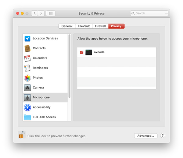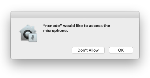 (2) A system dialog reporting that "nxnode" would like to access the microphone is issued on the Mac desktop: