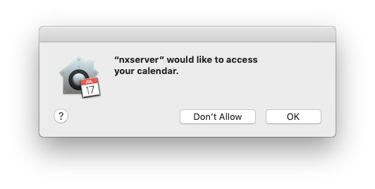 When a remote or local disk is connected via NoMachine and there are events in Calendar and/or photographs in Photos, the following system dialogs are issued. They allow to define if NoMachine will be allowed access to the calendar: