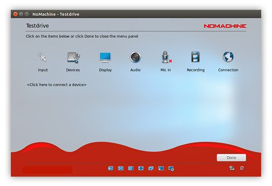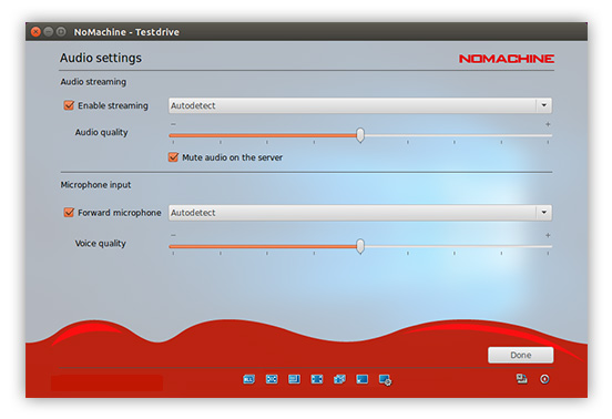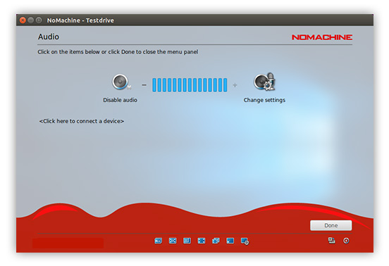Enable louder (more blue bars) or lower (fewer blue bars) audio volume. NoMachine automatically detects the audio settings on the remote host to work out-of-the-box. Audio is enabled by default and can be disabled by clicking on the left of the volume slider. Disabling audio will mean you don't hear sound in your session, sound will continue to be heard on the remote host if it is enabled.
