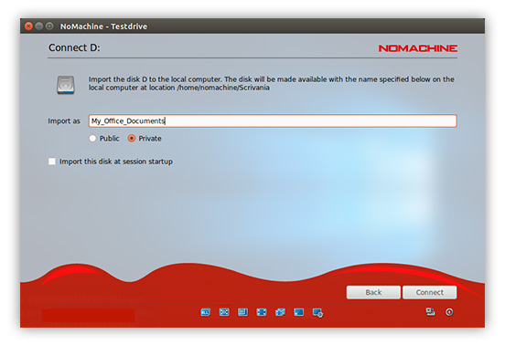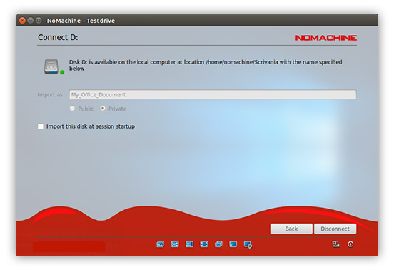 Choose this option if you want to make disk folders and their content available from local to remote or from remote to local. By connecting a local disk, you will be exporting the folder to the remote desktop. By connecting a remote disk, you will be importing to the local desktop. Provided the session is running, you will be able to copy files by dragging from the respective folder you just connected on to the desktop you are working on. E.g., if you just imported a remote folder to your local desktop, open the folder and drag the files outside the folder in order to copy them. For file-transfer between desktops, please consult section dedicated to The Monitor.