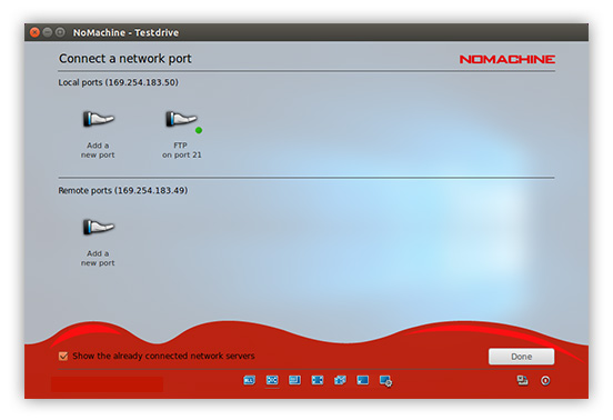 For example, an FTP server set up on a host may only be usable on the LAN at an organization and you therefore can't use it from outside the company network. Additionally, the fact that FTP is not encrypted can raise concerns. Connecting from an FTP client to the FTP server will be insecure or simply be blocked. Via NoMachine's Network Ports, you can establish a connection to the remote server and forward the FTP port from there to the local computer. NoMachine will create an IP for the user (for example, Fig. 12) and display it in the GUI panel once connected. The user will be able to connect from their FTP local client using the IP and port, and all file transfers and other operations will be transmitted to the FTP server using a secure and encrypted NoMachine transport tunnel.