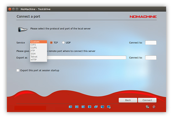 A predefined list of protocols used by the most popular network services such as CUPS, HTTP, FTP, SSH is available in the drop down list. You can also specify a custom port which will be forwarded and made available on the remote host just as if you were using it locally. By selecting a network service, NX will open an encrypted subnet circuit between the client computer and the server installed and will safely traverse firewalls that prohibit or filter certain services over specific ports.