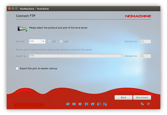 Import or export a custom network port such as TCP or UDP. For example, to export a service from the local PC that uses UDP to communicate (e.g. DNS, VoIP), choose the UDP option in the NoMachine GUI. The protocol selected must be consistent with the one required by the service specification.