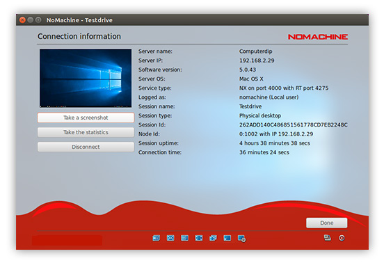 Find out basic information about your remote session, including NoMachine software product & versions, server name, IP address, user name, session name, how long the session has been connected, and more.