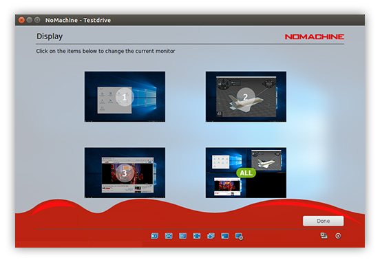 This icon appears when multi-displays are detected on the remote side (physical desktops only). Let users switch between applications which are running on different monitors. When connecting to the remote desktop, NoMachine detects that there are multi-monitors and will show the number accordingly. The keyboard short cut Ctrl-Alt-I is available to quickly identify which monitor is being viewed.