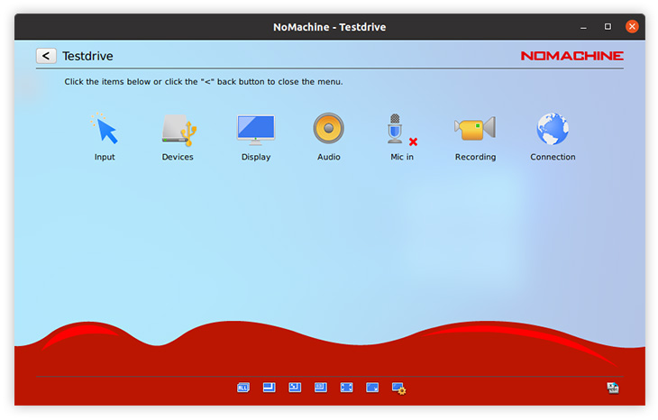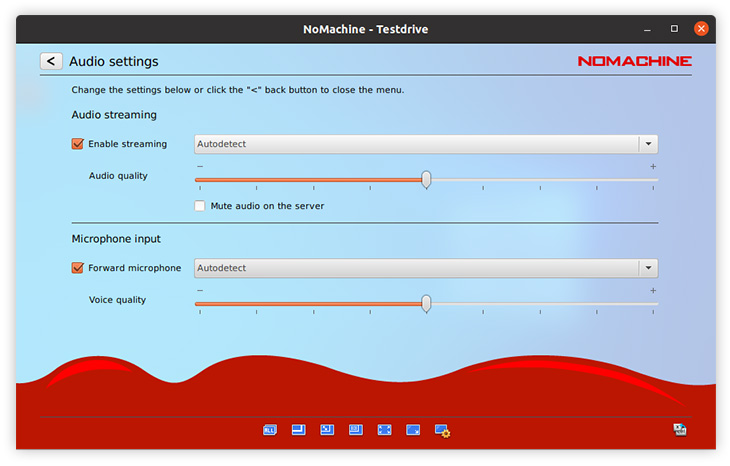 Enable louder (more blue bars) or lower (fewer blue bars) audio volume. NoMachine automatically detects the audio settings on the remote host to work out-of-the-box. Audio is enabled by default and can be disabled by clicking on the left of the volume slider. Disabling audio will mean you don't hear sound in your session, sound will continue to be heard on the remote host if it is enabled.