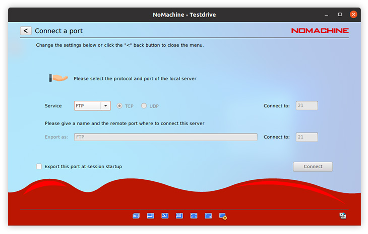 Import or export a custom network port such as TCP or UDP. For example, to export a service from the local PC that uses UDP to communicate (e.g. DNS, VoIP), choose the UDP option in the NoMachine UI. The protocol selected must be consistent with the one required by the service specification.