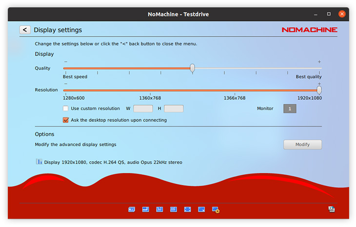 In most cases, although NoMachine will display the remote screen according to the preferences selected in points 5.2 and 5.3 the user might still prefer to resize the remote screen content to use the available space on the client screen. NoMachine will indicate on the slider the most standard resolution options, which are taken from the server side list of supported resolutions. Move the slider according to your preference.