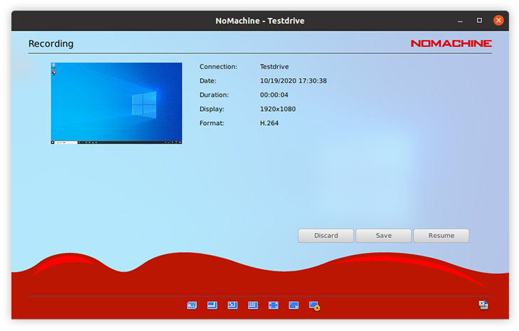 Clicking Stop in the recording bar will prompt NoMachine to ask you whether to discard, save or resume. Save a recording will save it to your local NoMachine folder. To start again without saving, select Discard. To continue with your recording, click Resume.
