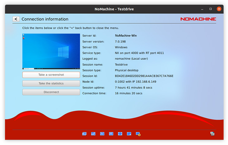 Find out basic information about your remote session, including NoMachine software product & versions, server name, IP address, user name, session name, how long the session has been connected, and more.