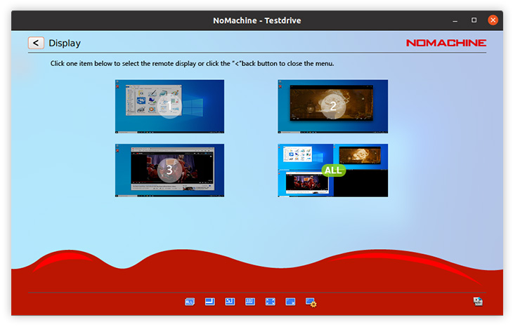 This icon appears when multi-displays are detected on the remote side (physical desktops only). Let users switch between applications which are running on different monitors. When connecting to the remote desktop, NoMachine detects that there are multi-monitors and will show the number accordingly. The keyboard short cut Ctrl-Alt-I is available to quickly identify which monitor is being viewed.